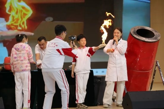 科学秀现场,一系列趣味实验依次展开:在“火箭发射”环节,学生们亲手操控模型火箭,体验升空瞬间的激动;“火焰掌”实验中,师生们手掌托起燃烧的泡沫,亲眼见证火焰在手中舞动却毫发无伤的科学奇观;“神奇的液氮”则将大家带入冰雾缭绕的世界,通过玫瑰花的瞬间脆化,直观感受极低温的神奇。